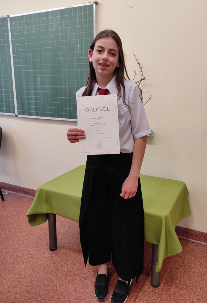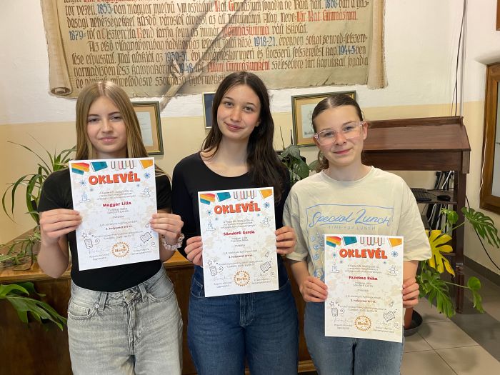 A versírás kategóriában – amelynek témája „La mia Italia” volt – Balogh Maja (10.B) 2. helyezést, Berberovics Flóra (9.C) 3. helyezést ért el, Balogh Bíborka (9.D) pedig dicséretben részesült. A feladat egy legfeljebb 20 soros, olasz nyelvű, kreatív vers megalkotása volt, önálló költői megoldásokkal.