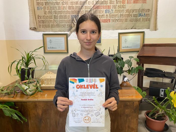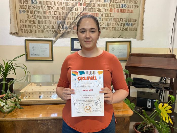 Cirkl Csenge (10.D) a Pécsi Tudományegyetem Olasz Tanszéke által meghirdetett esszéírás kategóriában 2. helyezést ért el. A pályázat címe: „5 gesti da non perdere in Italia”. A feladat során a diákoknak olasz nyelven kellett bemutatniuk öt jellegzetes olasz gesztust, ismertetve azok jelentését és használati helyzeteit, kreatív megközelítéssel, akár képi elemek bevonásával.