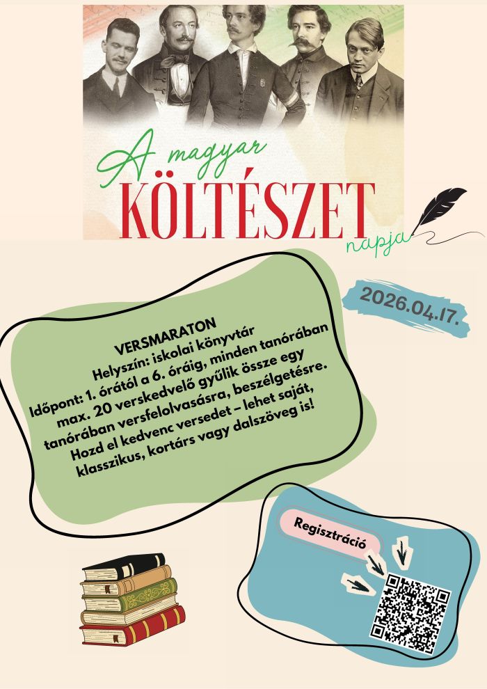 Iskolánkban ebben a tanévben február 17-én ünnepeltük a magyar költészet napját – VERSMARATONNAL. Hat tanórában érkeztek diákok a könyvtárba, tarsolyukban egy-egy verssel, amit felolvastak, megosztottak a többiekkel, és rövid, kötetlen beszélgetés alakult ki a művekről. Klasszikus, modern és kortárs vers egyaránt érkezett, a diákok zömében 11-12. évfolyamosok voltak. A versmaraton szervezője és moderátora László Erika tanárnő volt.