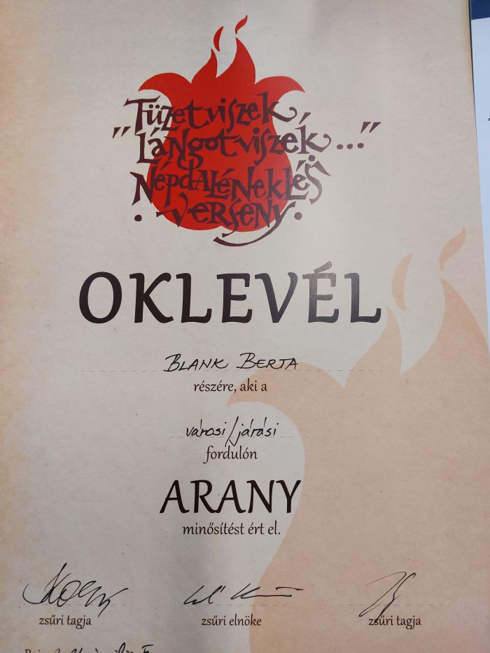 Március 22-én a Nits Márta Országos Népdaléneklési Versenyen Blank Berta 11.C osztályos tanuló kiemelt arany, Tóth Sarolt 9.D osztályos tanuló ezüst, Koprivanacz Luca 8.B osztályos tanuló pedig arany minősítést szerzett.