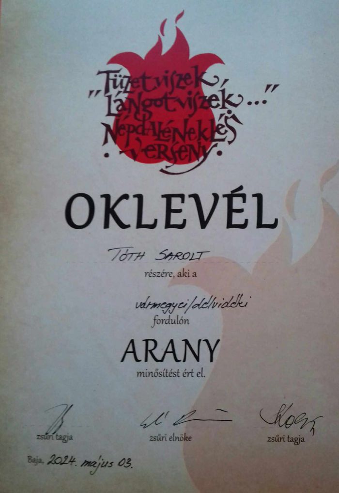 Május 3-án került megrendezésre a Tüzet viszek, lángot viszek ...Gyermek és Ifjúsági Minősítő Népdaléneklési Verseny vármegyei/délvidéki fordulója, ahol Blank Berta 11.C osztályos tanuló kiemelt arany és a Vadvirág népdalkör is kiemelt arany minősítést szerzett.