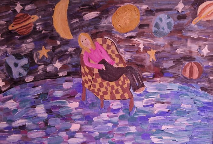 Kanyó Bence hónapokon át tartó munkával aprólékosan kidolgozott, kicsinyített katonai erődöt hozott létre – egy teljes fantáziavilágot, amelyben már csaták is zajlottak. A részletek szinte életre keltnek ebben az egyedi makettben. Sipos Sára egy álomszerű festménnyel bűvölt el minket, amely egy fiatal lányt ábrázol, amint egy fotelben ülve a végtelen űrt szemléli. Az élénk színek és a játékos ecsetvonások Van Gogh stílusára emlékeztetnek, és a képzelet határtalanságát közvetítik. Minden alkotás a gyermeki fantázia erejét mutatta meg.