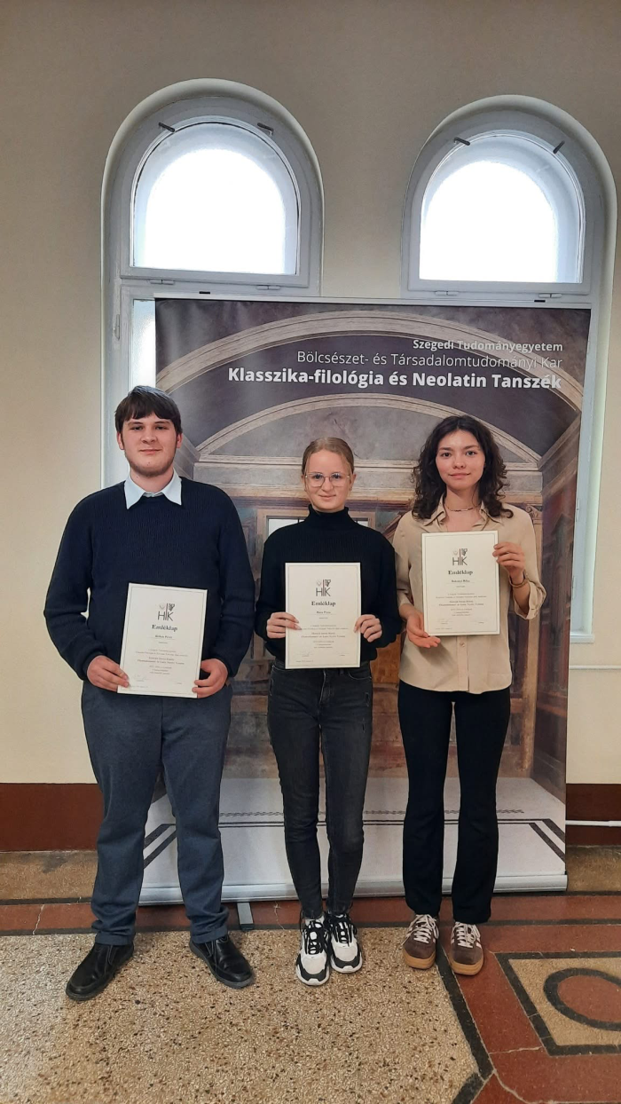 A Horváth István Károly Ókortudományi ès Latin nyelvi verseny országos döntőjében kiválóan szerepeltek tanulóink a Szegedi Tudományegyetemen: Birkás Péter 10.B, Rácz Petra 10.A ès Bakonyi Réka 10.B. A diákok szakkör keretében heti egy órában tanulják a latint, így különösen értékes számunkra az elért eredményük. Felkészítő tanáruk: Arnóczkiné Kiss Margit