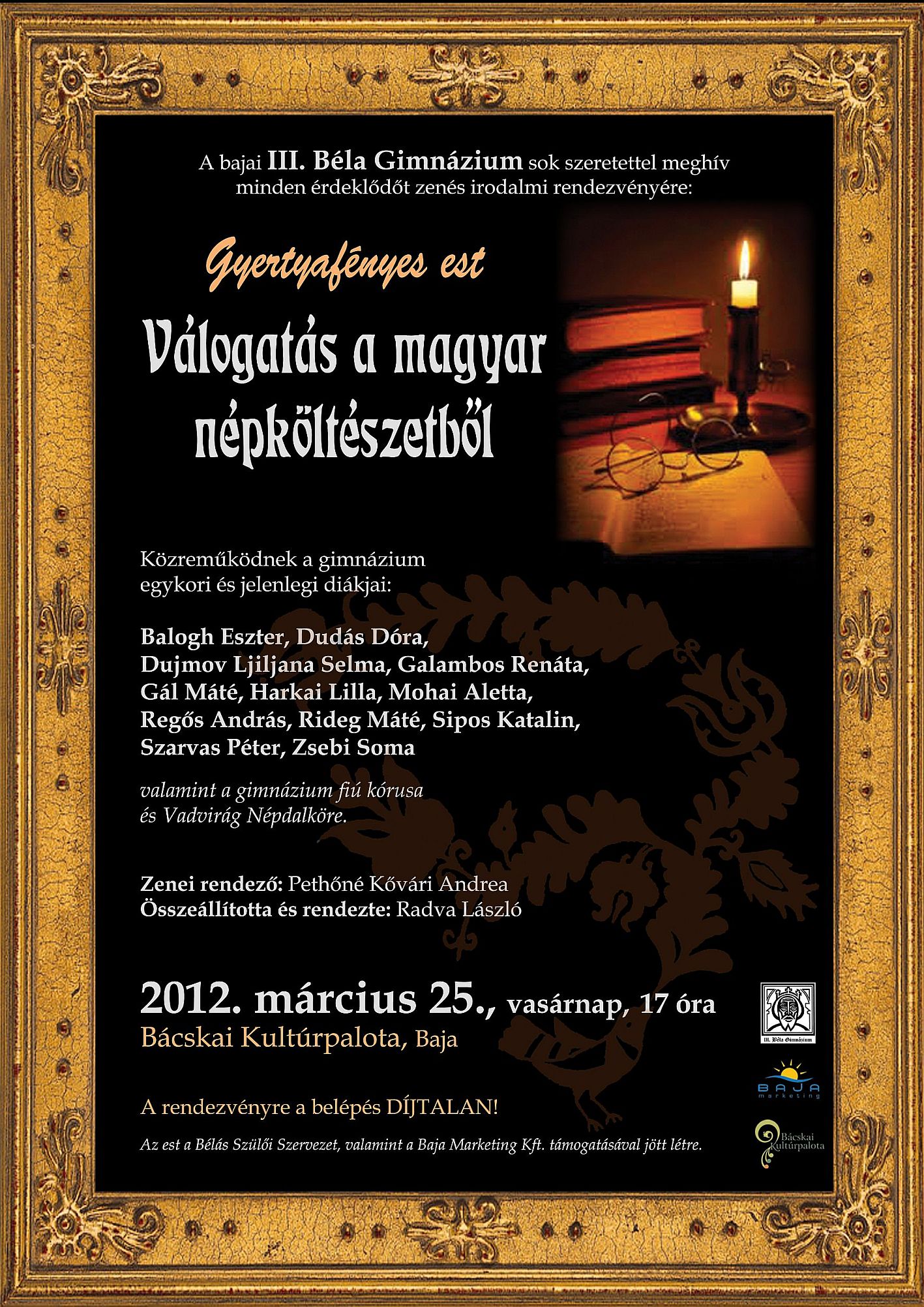 A III. Béla Gimnázium az idei évben is megrendezi immár hagyományos Gyertyafényes estjét. Az idei évben a magyar népköltészet gyöngyszemeibõl válogatott egy csokorra valót a rendezvény szervezõje, Radva László.