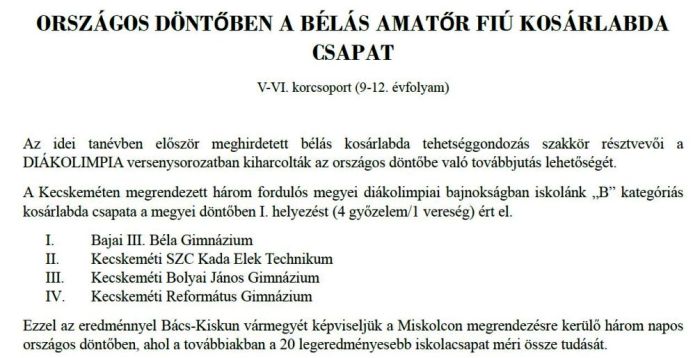 Bács- Kiskun vármegyét és iskolánkat Steiner Letti 10. C osztályos tanuló képviselte az országos verseny végső, harmadik megmérettetésén. Implom József születésének 125. évfordulója alkalmából 125 diák mérte össze tudását az országból, illetve a határokon túlról. A tanulóknak először tollbamondást kellett írniuk, majd laptopon helyesírási feladatokat megoldaniuk. Letti, bár nem ért el dobogós helyezést, szépen szerepelt, jó eredményeket ért el. Felkészítő tanára Schmélné Janotka Ilona volt.