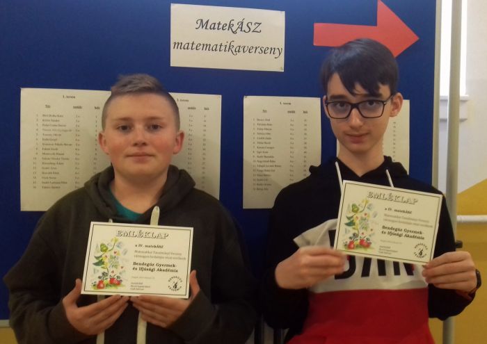 A Bendegúz Akadémia matekÁsz Matematikai tanulmányi versenyén a vármegyei fordulóban 3. helyezést ért el Hársch Adrián 7.B osztályos tanuló, aki továbbjutott az országos döntőbe és 5. helyezést ért el Lajdi Horka 7.A osztályos tanuló. Felkészítő tanáruk Steingártné Molnár Mária.