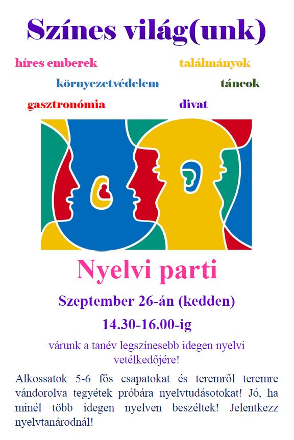 A Bajai III. Béla Gimnázium idegennyelvi munkaközössége nyelvi napot szervezett szeptember 26-án a Nyelvek Európai Napja alkalmából. A nyelvtanárok több helyszínen várták a diákokat egy kis csevegésre a délelőtt folyamán az óraközi szünetekben. A bátor diákok jutalmul sütit, teát, édességet vagy apróbb ajándékot kaptak. Délután került sor a hagyományos nyelvi parti megrendezésére. A 6-8 fős csapatok hét helyszínen tették próbára angol, német, olasz, orosz illetve francia nyelvtudásukat különböző témák kapcsán. A Színes világ(unk) elnevezésű parti témái között szerepelt a gasztronómia, környezetvédelem, híres emberek, találmányok, divat, sőt még néhány horvát tánclépést is megtanultak a lelkes résztvevők. A kb. 60-70 diákot megmozgató rendezvény jó hangulatban telt, és ismét megmutatta, hogy érdemes idegen nyelveket elsajátítani.