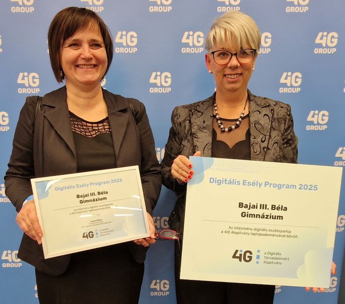 Iskolánk kiemelkedő eredményt ért el a 4iG Alapítvány „Digitális kompetenciafejlesztés” elnevezésű pályázatán: a 224 beérkezett pályázat közül intézményünk Diákönkormányzata a 15 nyertes között szerepelt, és 6 laptopot nyert. A pályázatot Döményné Dobosi Lejla, a DÖK segítő pedagógus készítette és nyújtotta be, majd a díjátadón Budapesten személyesen vette át az elnyert eszközöket.