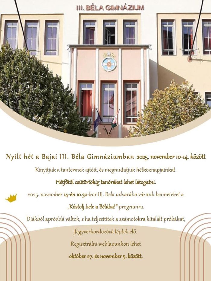 Szeptember 17-én rendezte meg a Bajai III. Béla Gimnázium magyar nyelv és irodalom munkaközössége az Édes anyanyelvünk nyelvhasználati verseny Bács-Kiskun vármegyei döntőjét. A Kazinczy-díj Alapítvány és az Anyanyelvápolók Szövetsége által kiírt versenyen a középiskolások először egy komplex nyelvi feladatsort oldottak meg, majd négy téma közül kellett választaniuk egyet, melyet háromperces időkeretben fejtettek ki a zsűri előtt.